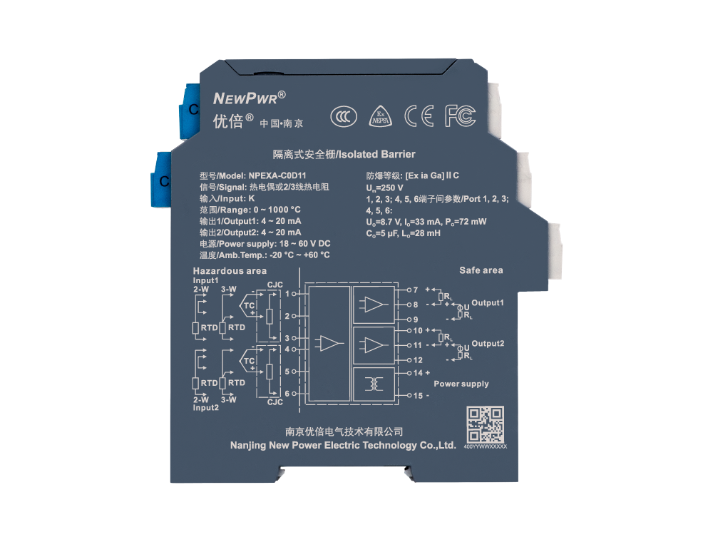 | 介電強度 | ≥ 3000 V AC (本安側與非本安側);≥ 1500 V AC (電源與非本安側) |